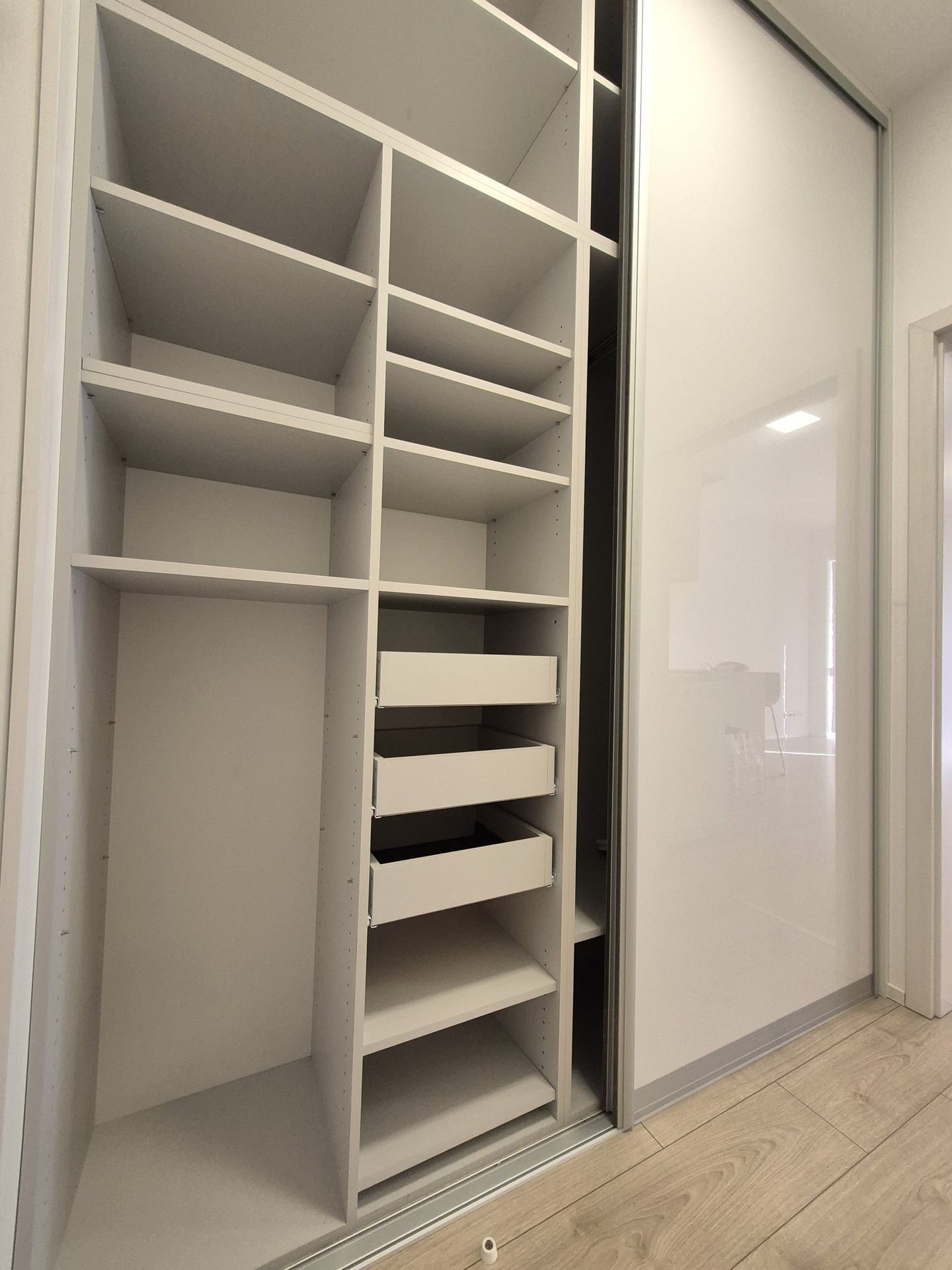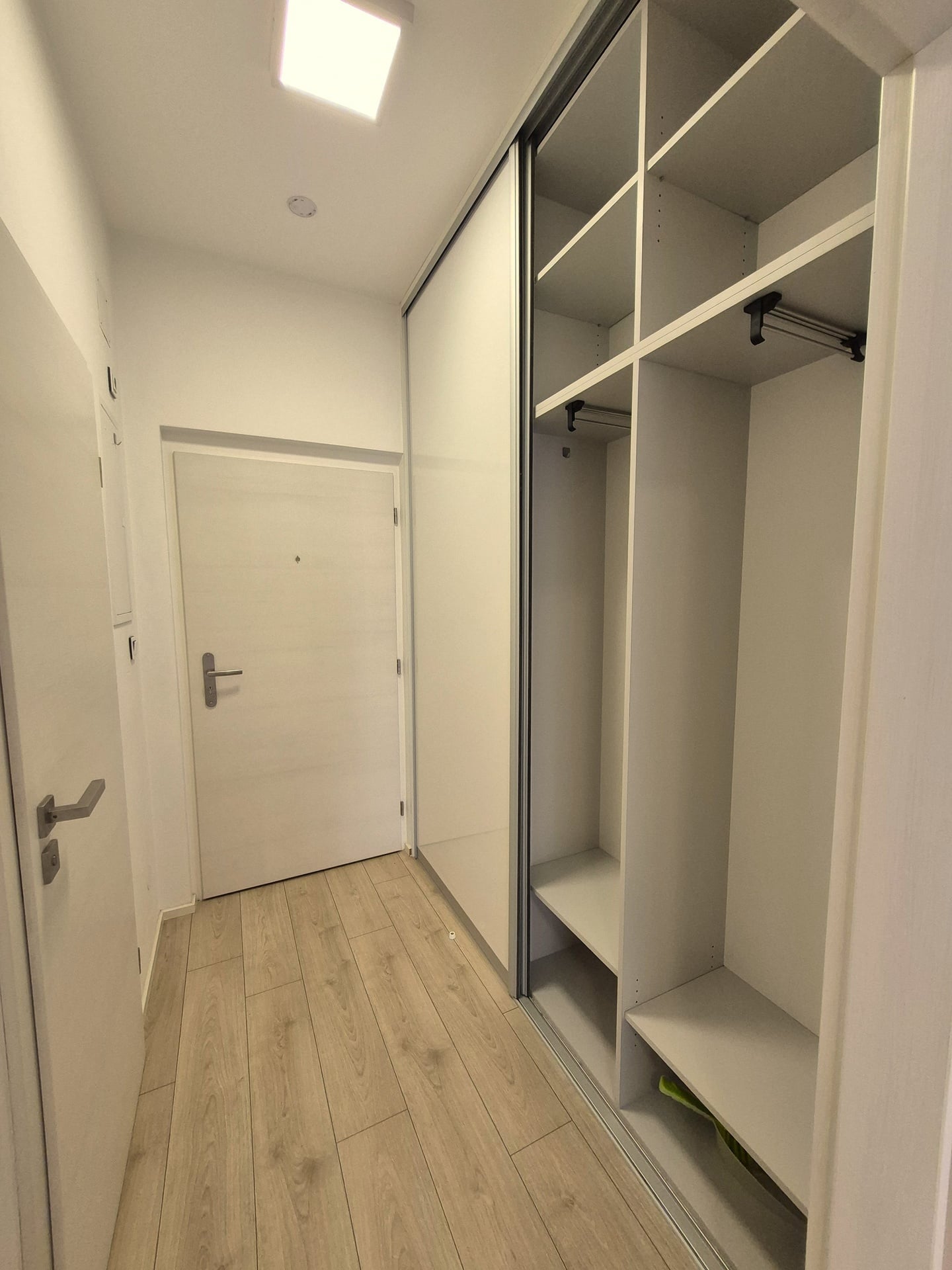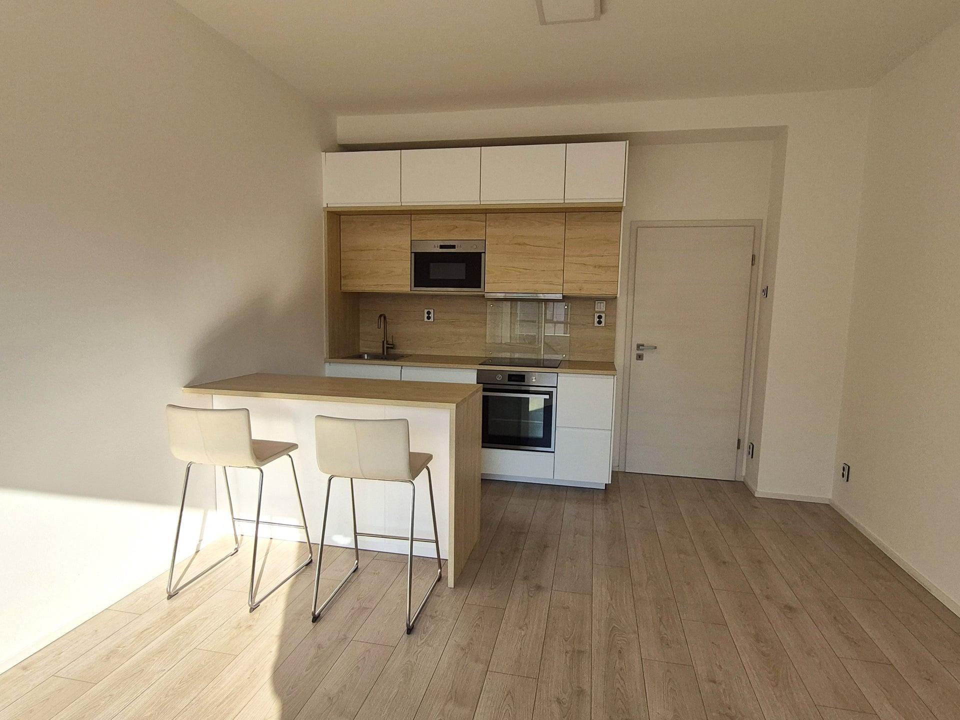 Součástí bytu je moderní kuchyňská linka s vestavěnými spotřebiči (varná deska, trouba, mikrovlnná trouba, lednice, digestoř s odtahem). V předsíni oceníte prostornou vestavěnou skříň, která nabízí dostatek úložného prostoru.